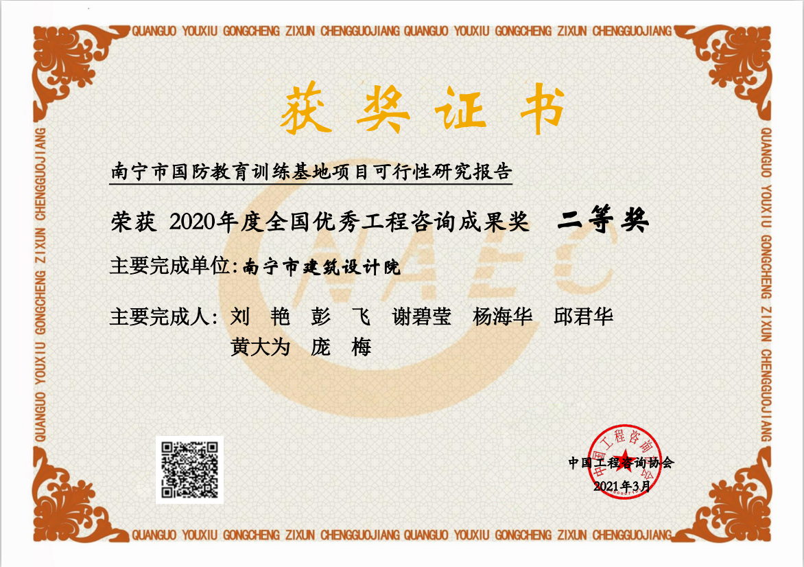 3月,中國工程咨詢協(xié)會發(fā)布了2020年度全國優(yōu)秀工程咨詢成果獎,由我公司申報的《南寧市國防教育訓(xùn)練基地項目可行性研究報告》獲得2020年度全國優(yōu)秀工程咨詢成果獎二等獎。此前,該成果報告還獲得了2020年度廣西優(yōu)秀工程咨詢成果一等等次。