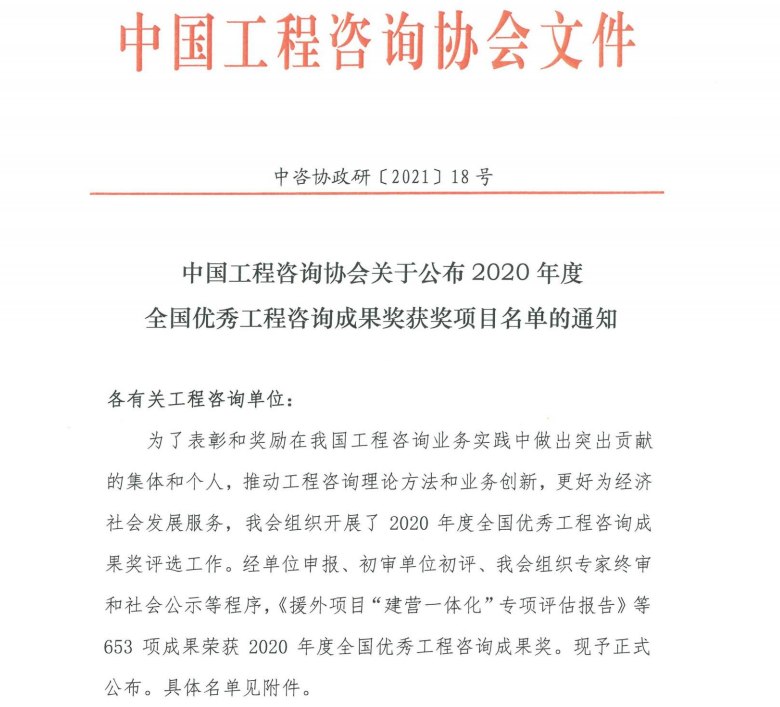 全國優(yōu)秀工程咨詢成果獎是由中國工程咨詢協(xié)會組織評選的工程咨詢行業(yè)權(quán)威性全國性獎項,涵蓋規(guī)劃咨詢、項目咨詢、評估咨詢、全過程工程咨詢、政策研究專題報告五部分內(nèi)容,每兩年評選一次,是我國工程咨詢領(lǐng)域最高獎。