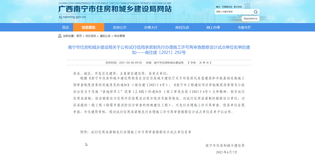 6月8日,南寧市住房和城鄉(xiāng)建設(shè)局發(fā)布《關(guān)于公布試行信用承諾制先行辦理施工許可再審查勘察設(shè)計試點單位名單的通知》(南住建〔2021〕292號)。